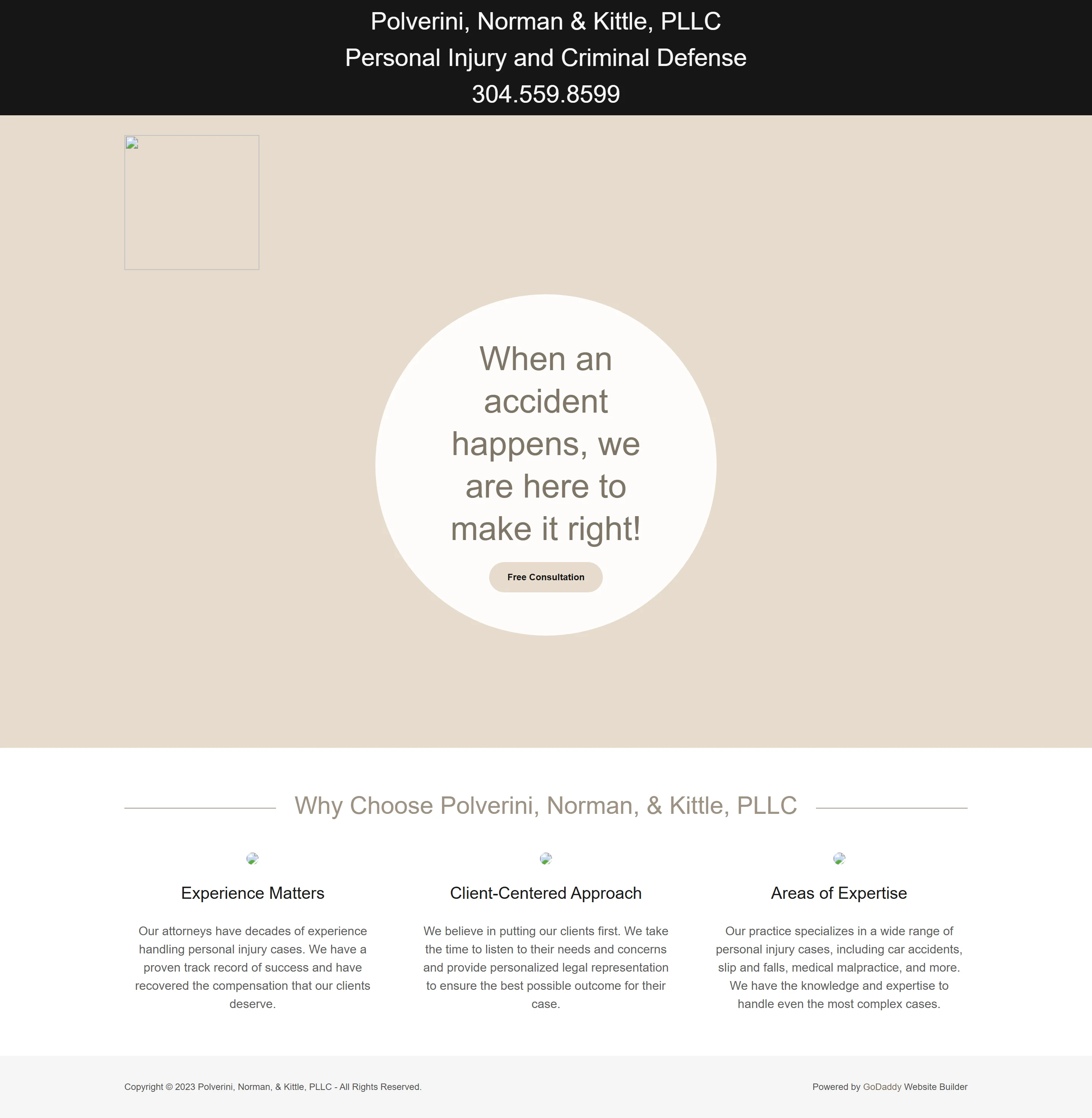 Replaced a sparse GoDaddy Website Builder site with a real marketing site: practice areas, case results, FAQs, contact.